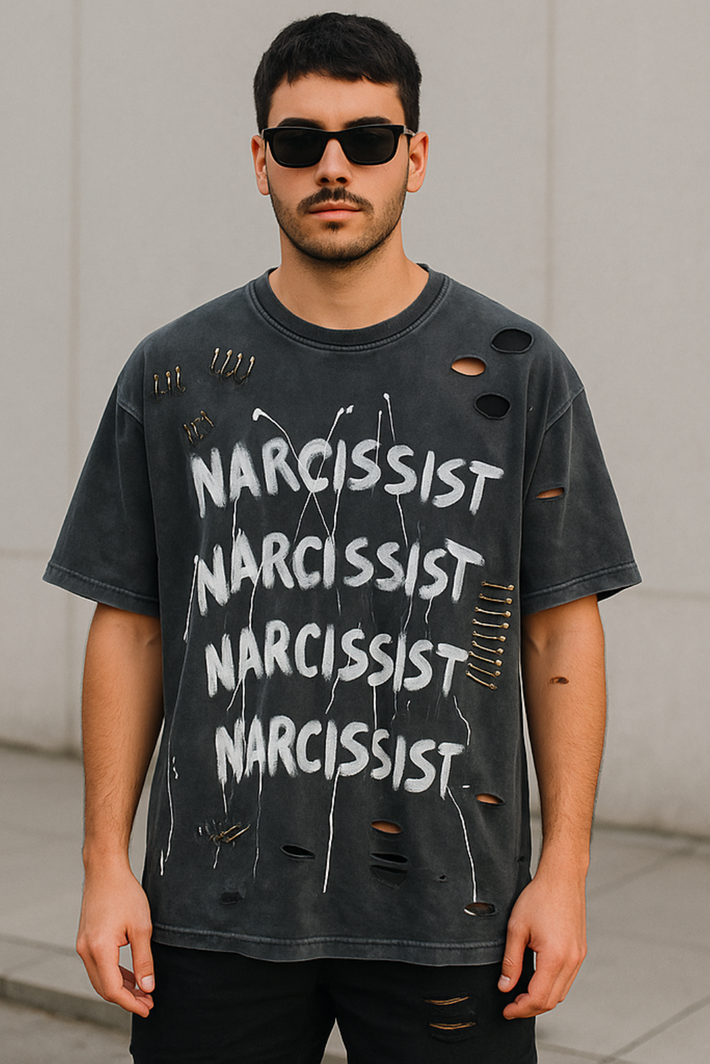 Dark, honest, and impossible to ignore – this vintage washed t-shirt bears the word “NARCISSIST” hand-painted in raw white, like a frontal stamp of an assumed or perhaps ironic identity.