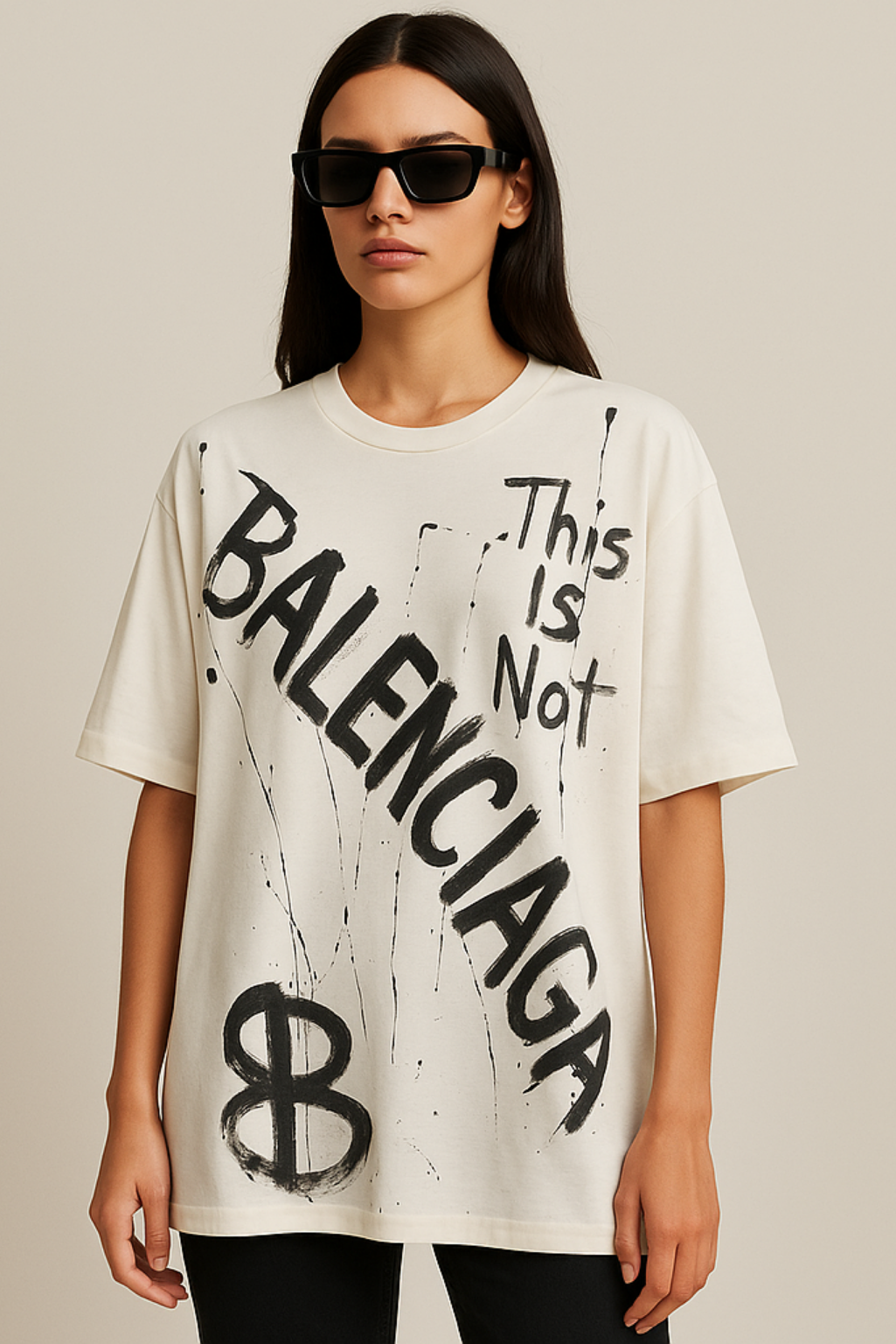 With a minimalist design, this hand-painted T-shirt is a real eye-catcher. Against a clean white background, the black graffiti-style text – “This is not BALENCIAGA” – is an artistic statement that questions brand fashion and street style. Each T-shirt is handmade, with individually applied splashes, writing and graphics, making each piece unique.