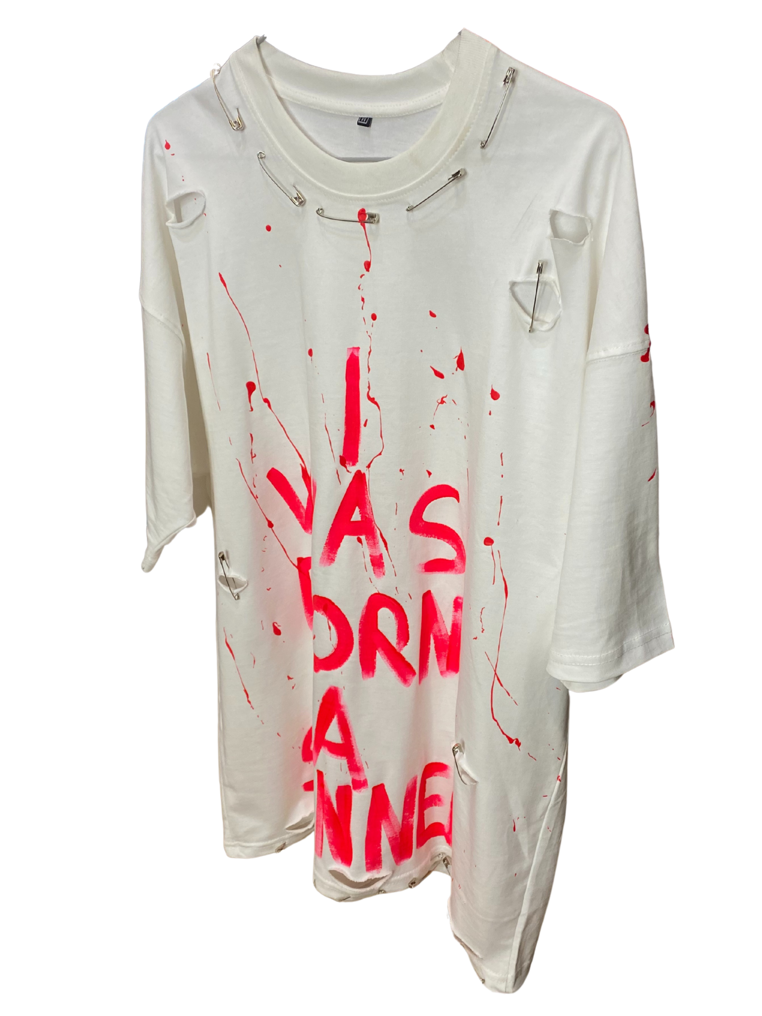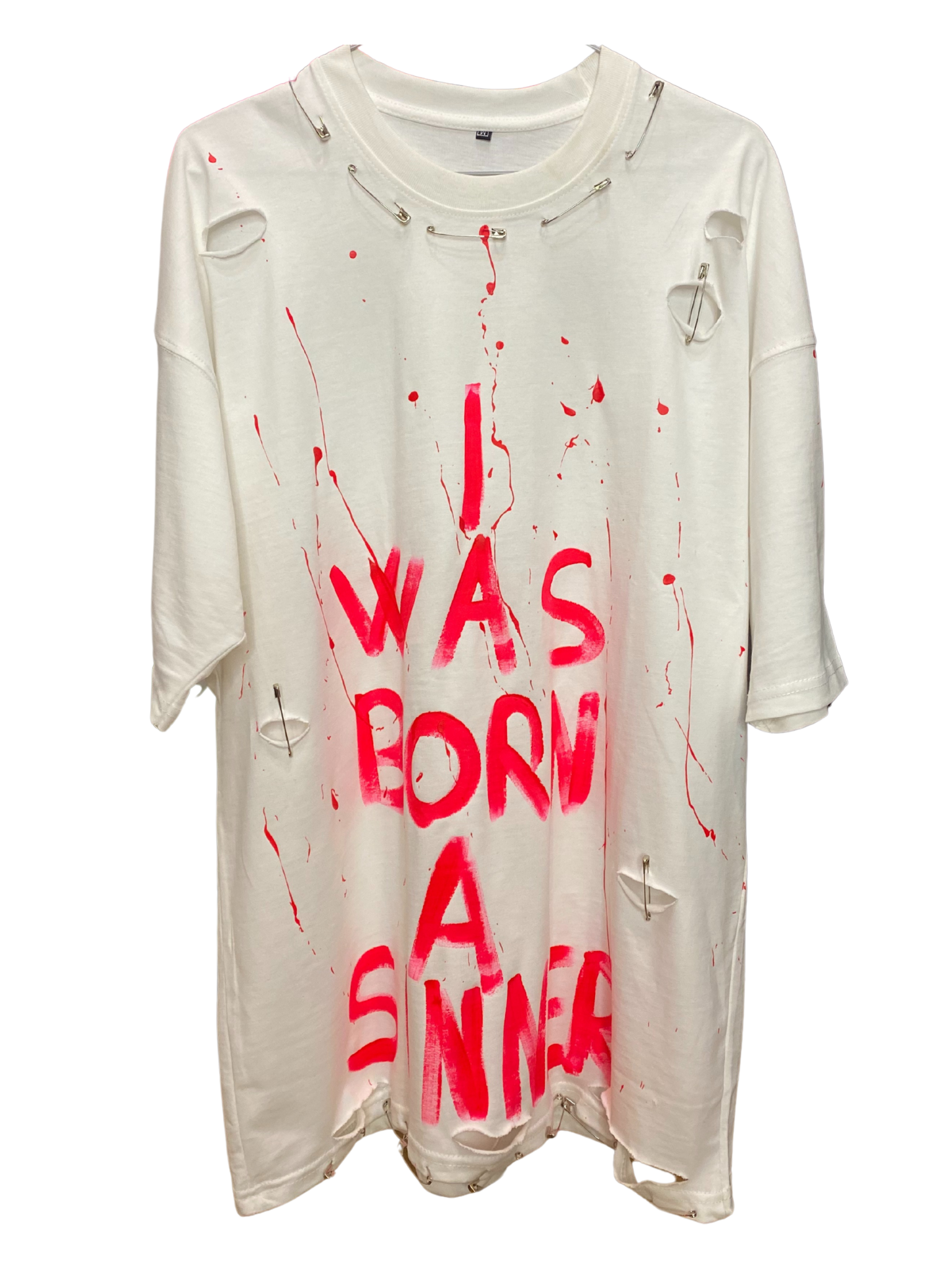 A fashion manifesto with punk and grunge influences, this hand-painted t-shirt is a statement of style and attitude. The bold message "I WAS BORN A SINNER" is written with a brush, accompanied by splashes of paint and effect details: deliberate cutouts, safety pin punctures and raw finishes. Each piece is individually crafted, resulting in a unique product.
