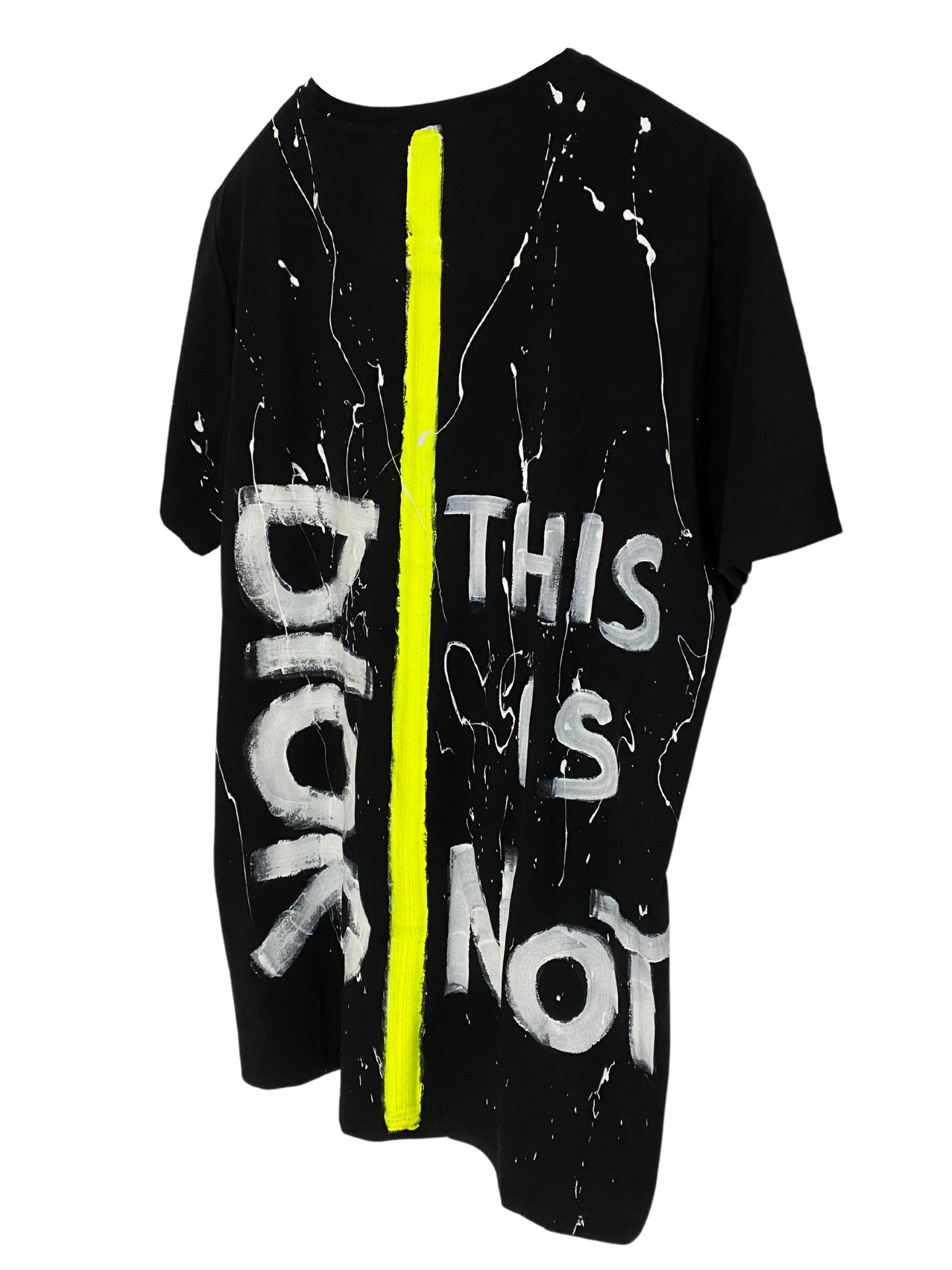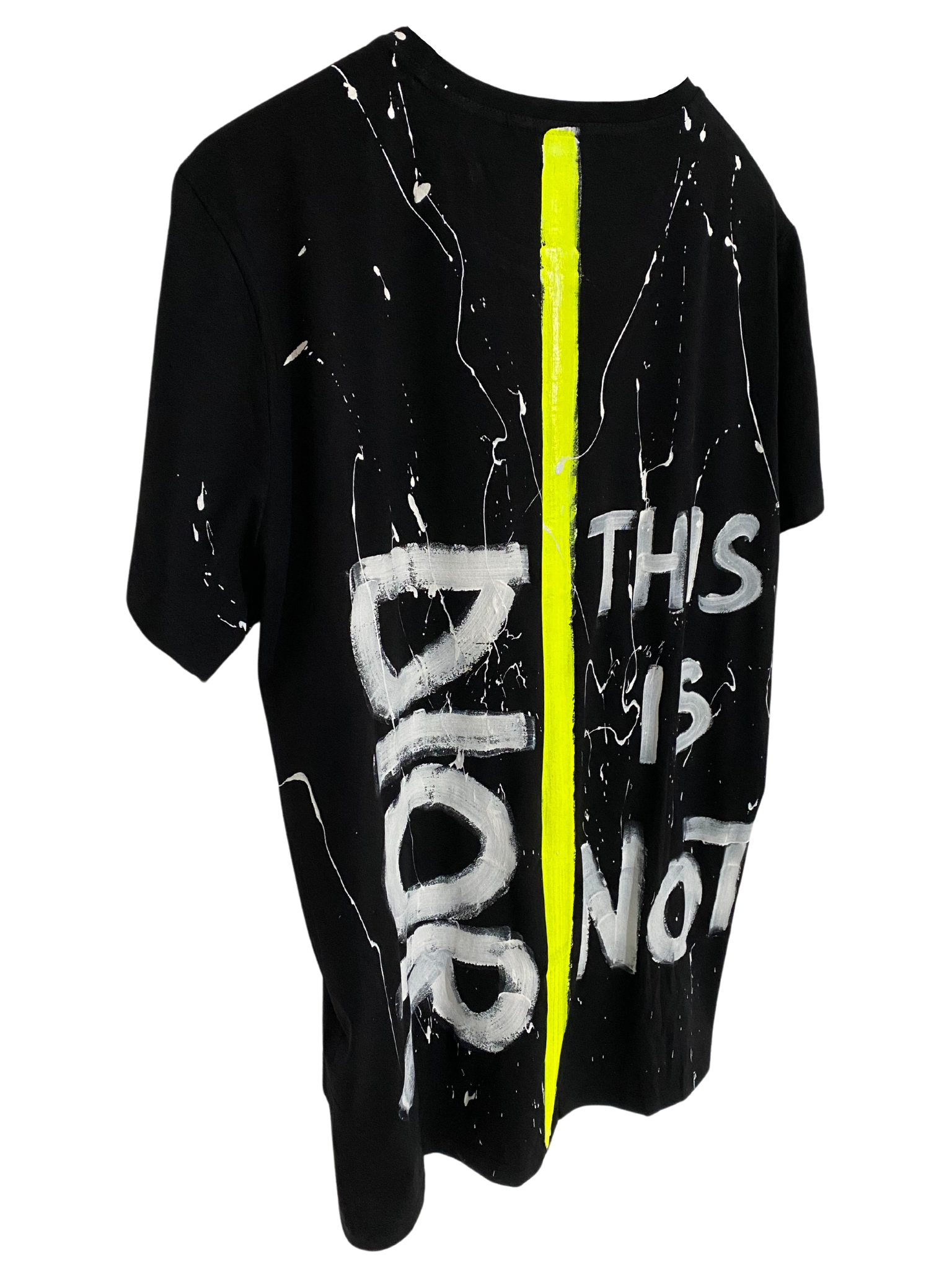 On a deep black T-shirt, the text "This is not Dior" stands out in pure white, contrasting strongly with the dark background. In a surprising accent, a vertical stripe in vibrant neon yellow runs down the middle of the T-shirt, adding an element of style and dynamism. This stripe not only underlines the provocative message of the T-shirt, but also creates a captivating visual effect, attracting attention and highlighting that the T-shirt is much more than an ordinary piece of clothing. It is a style statement that not only rejects commercial labels, but also celebrates individual originality and creativity.